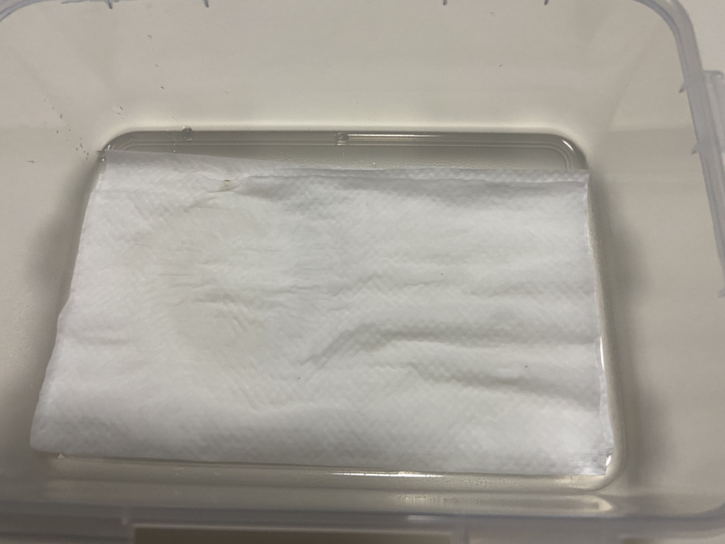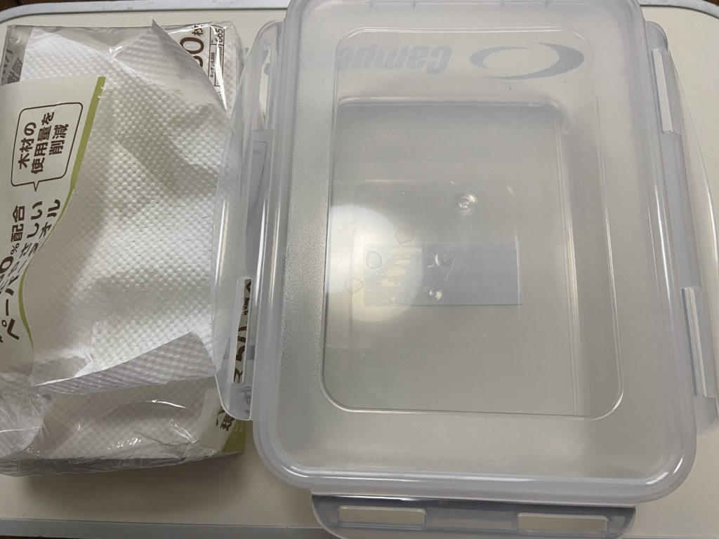 まず、用意したキッチンペーパーをタッパーの底に敷く